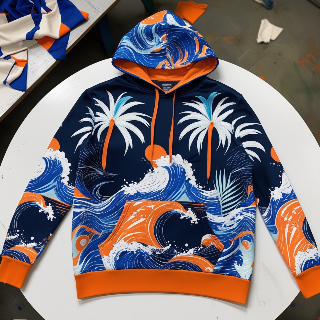 Unleash your inner wave rider with our Tropical Surf Wave Hoodie, the perfect fusion of streetwear fashion and coastal vibes. This all-season hoodie features a bold, all-over print of ocean waves, palm trees, and swirling patterns in electric blue, fiery orange, and crisp white on a deep navy base.